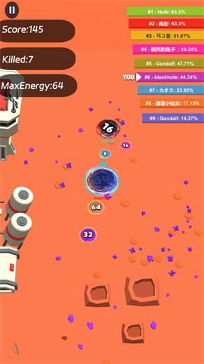 1、进入竞技场,面对激烈的战斗中的其他的黑洞,并且你的任务就是超过他们,让自己成为第一。