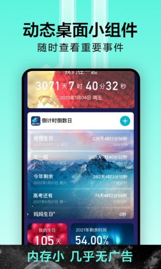 倒计时软件下载可以帮助用户记录各种有意义的纪念日。在倒计时软件下载上用户可以尽情设置各种重要的日子,每年都可以进行重复,这样就无须多次进行设置,用户可以看到时间的变化。结婚纪念日、家人朋友的生日或者是高考倒计时等等都没有任何的问题,用户可以设置专属的桌面小组件,打开手机就可以看到离目标时间越来越近,这样会有压迫感,像高考就会更加的努力,督促自己更好的进行学习,或者各种纪念日就可以提前准备好礼物以免忘记。还在等什么,快点下载起来吧!