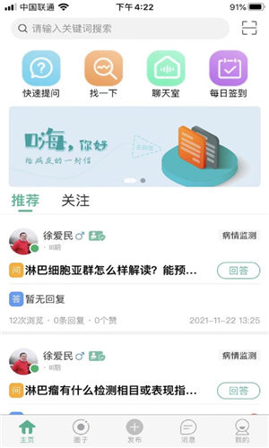 找病友app官方版是一个非常靠谱的病友交流社区,里面汇集了很多不同方面疾病的病人,让病友及其家人们可以在这里探索更多有利于治疗肿瘤疾病的方法。在找病友app官方版中大家可以自由提问自己感兴趣的内容,有任何不懂的疾病问题都可以在这里寻求帮助。并且软件可以让病友们互相鼓励前行,帮助肿瘤患者保持积极健康的生活态度。找病友app官方版会第一时间更新国际上的最新肿瘤疗法,从多渠道收集各种治疗手段。软件可以为用户们更好管理自己的疾病档案,为您对接更加专业的医生及相应药物。
