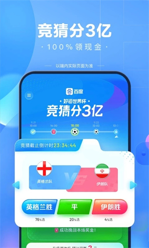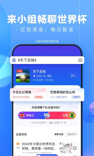 百度APP官方版这是一款十分强大的手机搜索引擎的功能,百度APP官方版能够给予你们搜索到你们想要知道的各种事情,存储的数据是你梦不可想象的,并且上面的功能简直就是特别丰富的,最近我们的卡塔尔世界杯不是很火热们,不过现在还没有开赛。在我们的软件上面可以看到各个参赛国家的名字。还有赛程的记录表,当然球迷们想要看到各种相关的资讯还有直播都没有问题,我们会实时的关注推送更多的资讯给你们收看。看热搜了解到每天所发生的各种事情,各种各样的新闻都可以了解得到,还有各种小说啊,视频都可以看,强大的引擎功能,可以拍照识图,想了解就来看看吧。