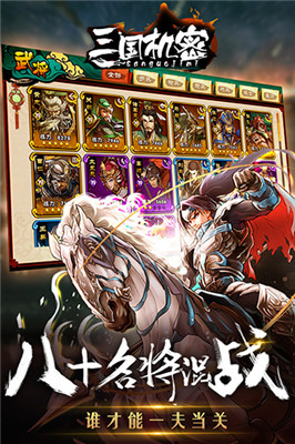 三国机密破解版是根据的同名小说改编而来的一款三国题材的策略RPG的手机游戏,使用全新的物理3D技术,打造出拥有精美细腻的画面、场景逼真的游戏世界,带领玩家体验全新不一样的三国世界。三国机密破解版高度还原了小说情节,在这里充满了尔虞我诈。更是高度还原了三国中的人物形象,如胆大心细的张飞、绝世佳人貂蝉、义气云天的关羽等等,超多三国武将美女等你来收集获取。除此之外,还有丰富多彩的对战模式,经典PVP模式还添加了竞技场元素,武将可以随时随地的与其他玩家在线实时对抗,带来全新不一样的游戏体验。