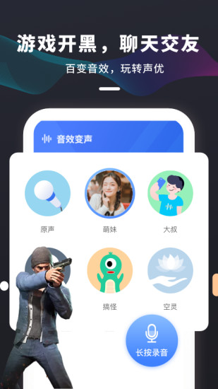 支持16种变声效果,软妹音、呆萌音、萝莉音、少女音、大叔音、惊悚音,搞怪音,空灵音,女友音,正太音.....百变音效,玩转声优。轻松扮演各种角色,吃鸡组队开黑,聊天,轻松变声。