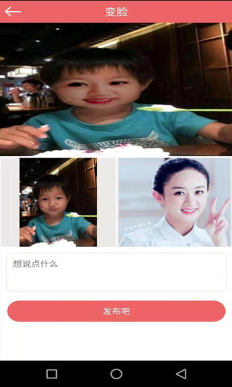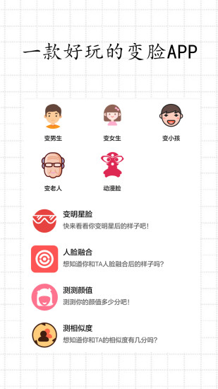 颜值变脸APP是一款非常有创意的人脸变换软件,丰富的变脸玩法,能将你变成男生、女生、儿童、漫画等等,你想要的这里都有。颜值变脸APP玩法简单,傻瓜式操作。你只需将要变脸的头像上传,一键脸型转变,就能为你生成你想要的照片,变脸效果好,非常有趣;同时平台还加入了人脸融合技术,你可以女朋友、明星等人进行融合,生成宝宝照片。颜值变脸APP还有专业的人脸评分系统,通过对你的人脸进行识别,运用大数据,看看你的颜值分,与好友进行PK;还有更多好玩的功能,持续更新中。