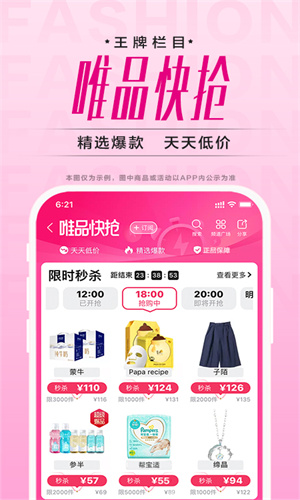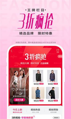 3、【正品行货 限时特卖】每天早10点&晚8点两场上新,服饰、美妆、亲子、居家百余大牌一折起,业界良心100%正品行货,让你逛到high;