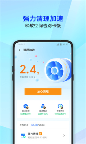 2、 手机加速:一键释放系统内存,彻底清理系统垃圾,加速手机运行速度;