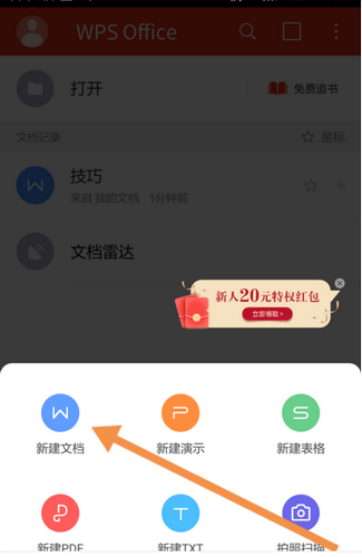 3、这时候下面弹出【文档】、【演示】、【表格】等等格式提示界面,点击【新建文档】。如图所示: