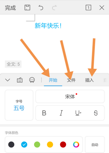 5、再输入你要你要编辑的文字,在底部【开始】、【文件】、【插入】等选项栏可以设置文本样式、文字大小、字体颜色,以及插入图片、表格、文本框等。