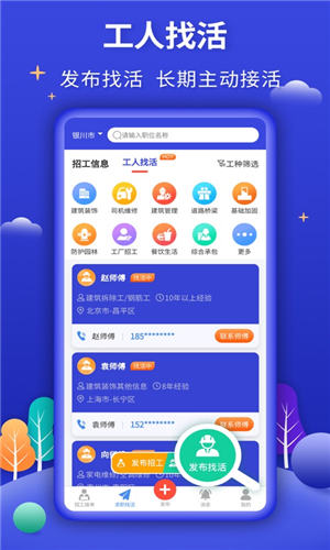 1、工人一键应聘、接单、找活。方便快捷,省去了大量的中间环节哦!