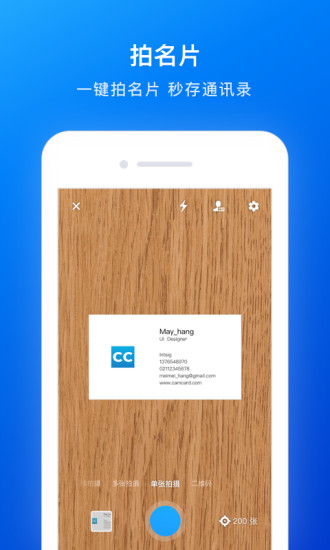 手机拍名片,瞬间精准识别,存入通讯录;支持一次拍摄多张名片,快速批量识别;支持识别16种语言名片、二维码名片,和邮件签名