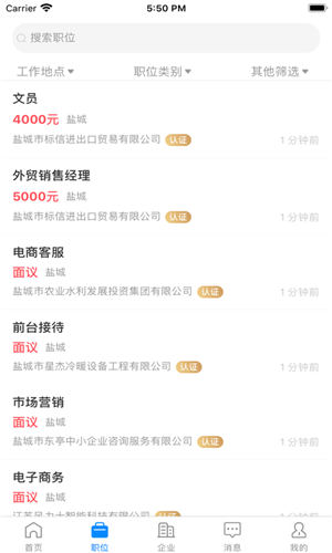 盐城人才网app官方版是盐城市民都在用一款网络求职app,可以让你足不出户的寻找工作,再也不用担心被陌生公司欺骗的问题。在这里所有入驻的招聘企业均经过资质审核,让人更加安心,欢迎用户对各种虚假招聘行为进行检举。盐城人才网app官方版可以为用户智能推荐迎合自身喜好的工作,让你可以无需亲自动手查找。平台旨在为市民带来更加省时、省心的求职体验,努力为用户收集更多优质的工作。并且在盐城人才网app官方版中各行业岗位资源应有尽有,可以更好满足不同领域人才的求职需求。