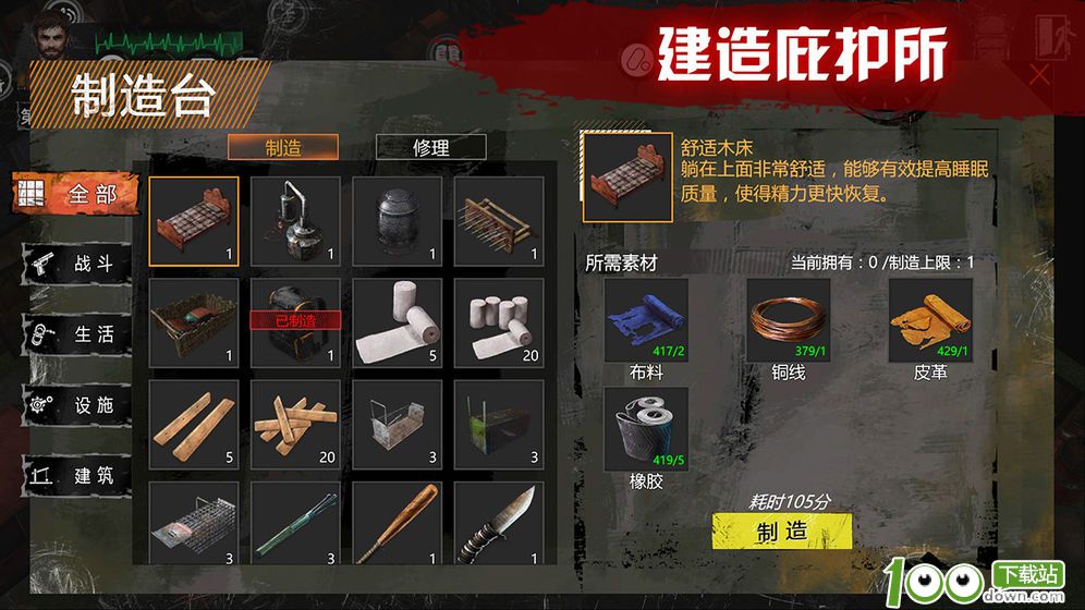 【3】精力:精力为零时玩家累死。精力在非休息时间自动流失,在床上休息则可以补充精力,床越好需要的休息时间越短,剩下的时间则可以制造更多东西。