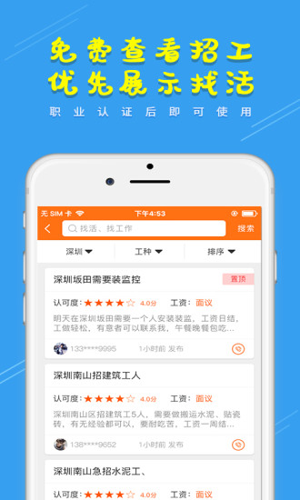 3、星级评价,甄选出认可度高的招工信息。