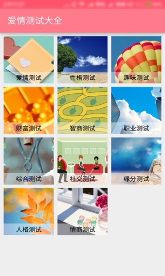 爱情测试大全app去广告绿化版是一款测试与爱情相关信息的软件,封面有大量的热门测试让用户们选择,还有十大类型的测试供用户们选择,它会根据用户们回答的问题,给出较为全面的分析供用户们作为参考。爱情测试大全app去广告绿化版十大类型测试任用户们选,选性格测试,测试用户们属于哪种性格,和哪种性格的人相处会比较和睦;有趣的智商问题测试用户们的智商;用户们还能选择情商测试,了解自己的情商是否还需提高;不清楚自己适合什么职业的用户们可以选择职业测试,测试哪种职业是符合你的;更多有趣的趣味测试逗你开心。用户们可以选择综合测试,全方面深入的了解自己哟!