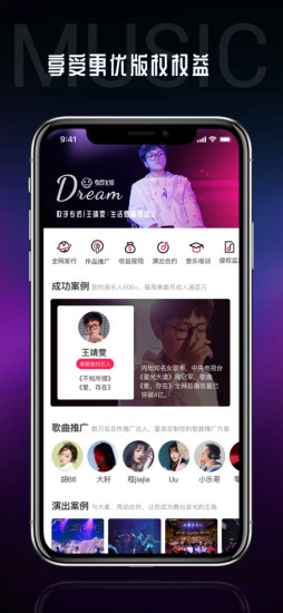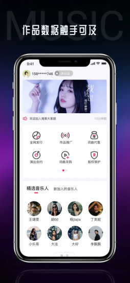 我们也会将你的作品向更大的方向去推广,还会实时监测版权情况。当然在这里你也可以欣赏到海量的原创音乐,还可以关注收藏你喜欢的音乐人。