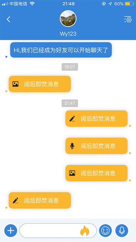 密聊模式,让你畅快聊一些私密的话题,阅后即焚,轻松保护自己的隐私。