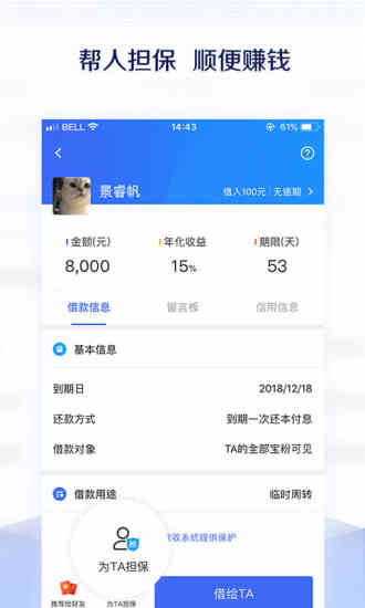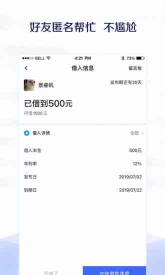 2、众筹借钱:金额、期限、利率都可以自订,手续费简单,成本低廉,开启新的借钱模式;