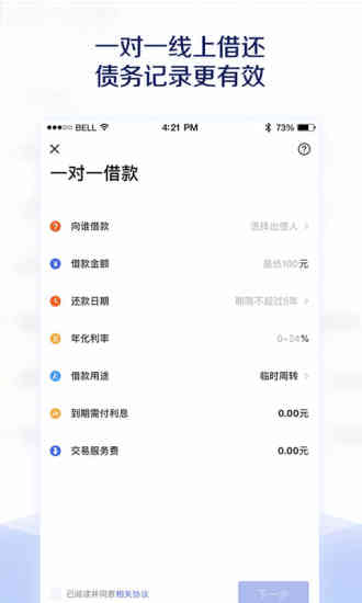 1、一对一借钱:手机打借条,签署正规协议就能借钱,还有提醒还款的贴心服务;