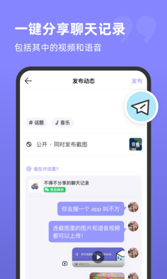 不方app是一个多人交友软件,在不方app上交友让你体验到游戏开黑的感觉,组队进行匹配,让你和你的好友一起进行匹配,多人进行聊天,才不会有两个人尬聊时的尴尬场景,你如果看上对方,但是又有点担心,你的队友就可以在这时帮你把把关,让你放心交友。不仅仅如此,还有聊天截图社区,让你在这里分享自己的搞笑瞬间,分享自己和好友的搞笑聊天。还可以将自己的聊天内容制作成视频,什么都能转发,让你成为大家的开心果。快来下载使用吧。