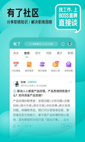 boss直聘免费版下载是一款专业的求职招聘软件,boss直聘免费版下载在BOSS直聘上面有着最专业的简历模板、工作招聘、求职岗位、生活辅助等等,不管你是想要找实习还是想要找全职、兼职等岗位,都可以来BOSS直聘上面找工作,这里有着最全的职业岗位提供,而且求职者沟通的对象都是公司高阶层的管理者,双方在线上就可以直接进行聊天对话,如果双方都符合自己的预期就可以直接拍板面试时间和地点,完全不会浪费双方线下的会面时间,求职者和招聘者双方可以直接进行精准匹配,不会再有信息差的情况出现,让专业的岗位就由专业的人来做。下载使用BOSS直聘,不用等待不用犹豫,选择自己心意的职业,高薪工作立马匹配给你。需要的小伙伴赶紧来下载吧!
