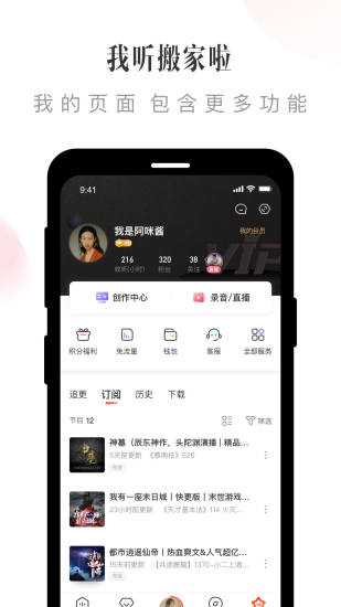 2.收集关注的主播,播放历史,阅读历史,订阅书籍,让用户快速找到自己听过的书