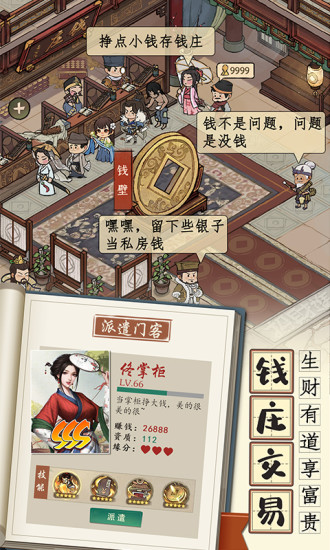 叫我大掌柜精简版无限元宝是一个充满的中国风的手游,在叫我大掌柜精简版无限元宝上你将要穿越回古代,经营自己的店铺,在这里认识奇人异事,有机会的话要招聘他们,他们其中不乏有跟你一样穿越而来的人,你要好好的对待他们让他们为你的店铺出谋划策。还有机会在这里认识到不一样的爱情,让你和其中的任务相知相遇,最后一起努力成为富甲一方的商人。游戏中的剧情让你体验到古代的烟火气息,不同于电视剧中皇宫的繁华,全是些市井气息。快来体验一下别样的古代吧。