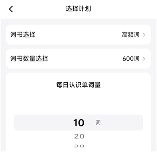 2、进入计划选择页面,选择每日认识单词,再点击词书选择;