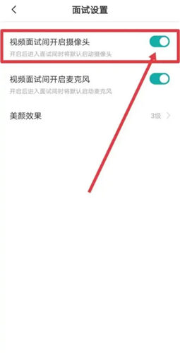5、来到面试设置,然后把【视频面试间开启摄像头】的按钮开启即可。