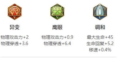 调和提高最大生命以及移速加成,提升回复能力;鹰眼和异变提高物理攻击和物理穿透,在一定程度上的提高了钟无艳的伤害,抗伤害的同时自身也可以打出伤害。