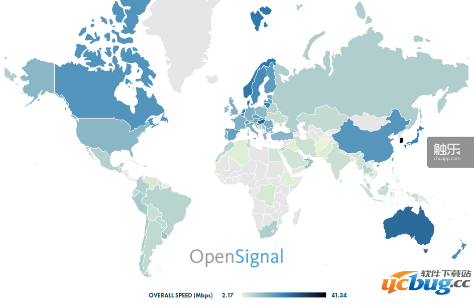 通常涉及网速的全球地图,中国的颜色往往很尴尬,但这次有种“拳打欧洲,脚踢美国”的感觉,有木有?图片来自:OpenSignal