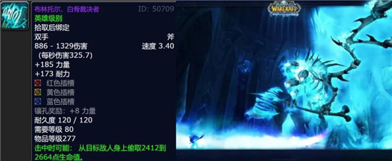 25人普通/英雄冰冠堡垒1号BOSS玛洛加尔领主掉落,俗称吸血斧。BOSS同款外观,是很多板甲DPS玩家当年有机会拿到的唯一一把277武器,DKT和邪DK用它尤为不错。