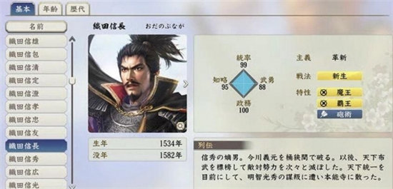信长,魔王(部队能力上升,估计是全能力小~中幅度上升)霸王(对郡瞬时压制)炮术(部队铁炮lv上升?本代看着没兵种区分了,估计要靠叠政策和特性体现兵种),战法:新生(攻击上升?)