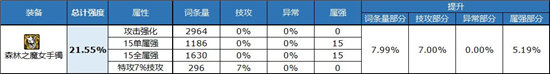 而手镯部位自定义专属词条普遍不太行,森林魔女手镯的属强词条实战发挥一般也受到严重限制,当7属强来看待,就太吃亏了。30毒伤只能配合戒指的转化词条发挥,杠杆只有10%也导致加成倍率远低于原本手镯五五开的异常占比结构的收益,对于绝大部分职业而言,几乎是一条废设。