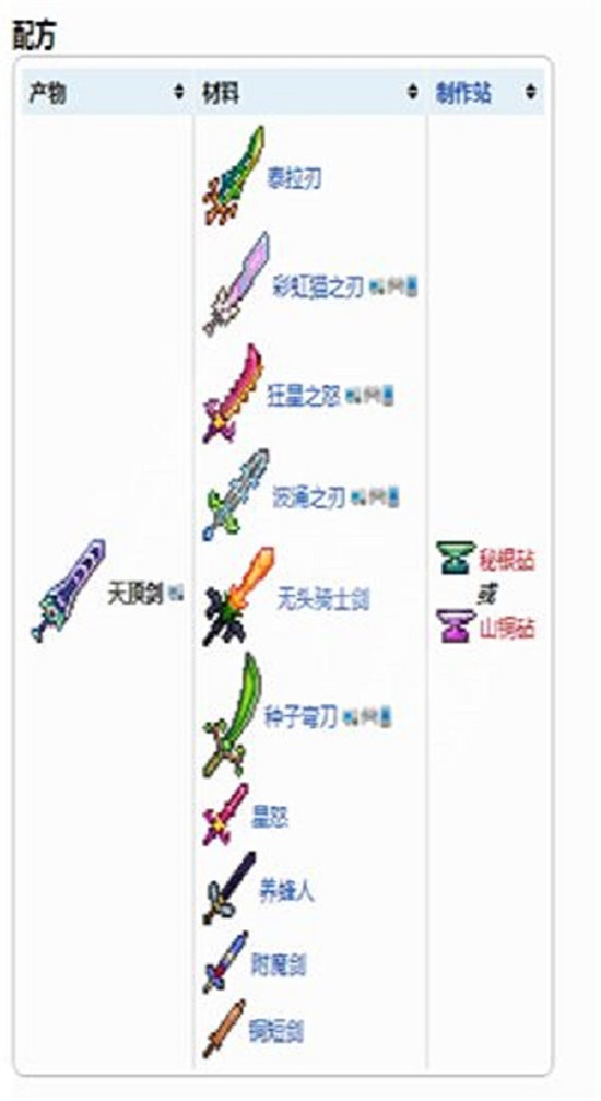 1、合成配方:虹猫之刃、泰拉刃、狂星之怒、波涌之刃、无头骑士剑、种子弯刀、星怒、养蜂人、附魔剑、同志短剑
