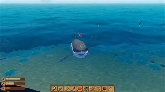 打鲨鱼的流程就是先抛锚把木筏停住,拿出矛下水,锁定鲨鱼从哪个方向向你游来