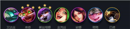 1、阵容组成:艾达丝、库奇、崔丝塔娜、金克丝、娑娜、璐璐、巴德