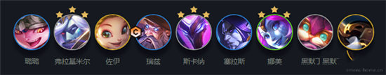 1、阵容组成:璐璐、弗拉基米尔、佐伊、瑞兹、斯卡纳、塞拉斯、娜美、黑默丁格、巴德