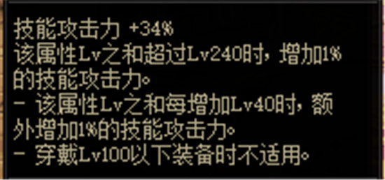 此外,所有部位的装备词条总和每40级,会为该装备额外提供1%的技能攻击力加成。而单件装备词条总和超过240时,还会增加1%的技能攻击力。