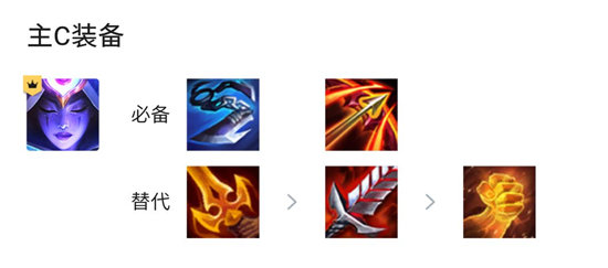 豹女必备杀人剑巨杀飓风,纳尔给肉装,乌鸦给功能性装备,切记不要把纳尔的装备给妮蔻,妮蔻被动可复制友方双抗,给纳尔装备俩个人都有好处。