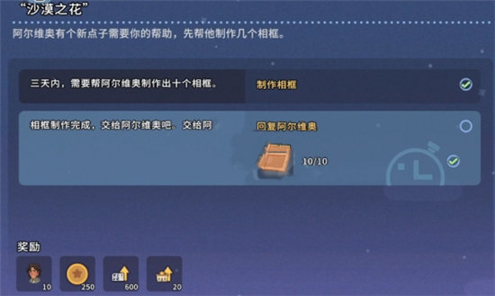 完成阿尔维奥相关人物“沙漠之花”。任务需要10个相框,用木板和纸可以做,玩家可以提前准备。触发剧情后需要帮阿尔维奥拿回沙漠之花照片。任务还可以获取阿尔维奥和阿蜜拉的好感度。