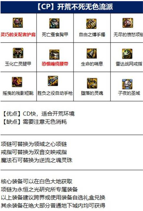 4、开荒不死无色流:望穿尽头的视线 暗影流光战袍 重奏者 无尽的愤怒项链 侵蚀的意志护腿 天才技术大师的百宝腰带 幻影之触控制面板 双音交映戒指 天才技术大师的加厚长靴 胜负之役自动手枪 无色冰晶耳环 迷你电池包