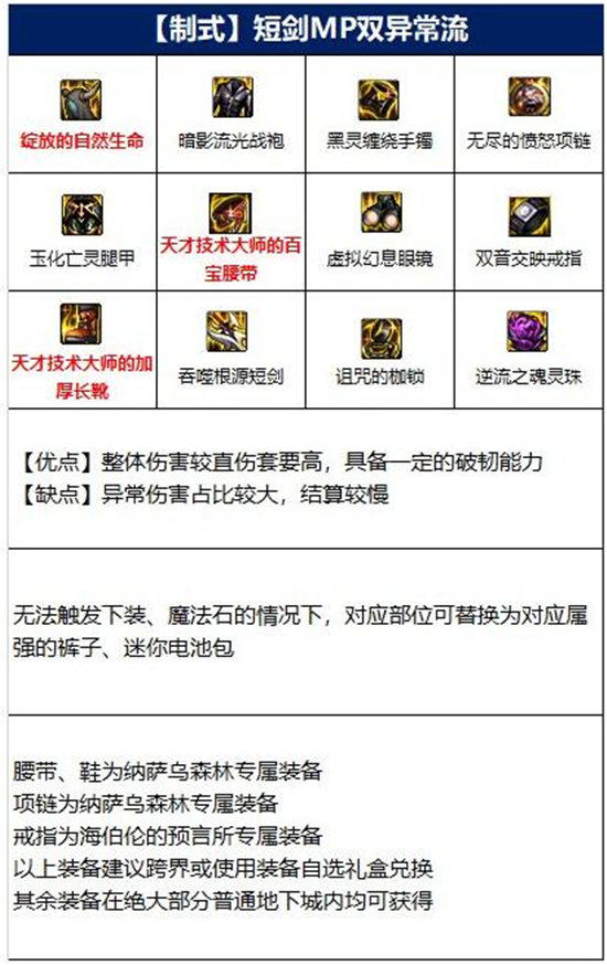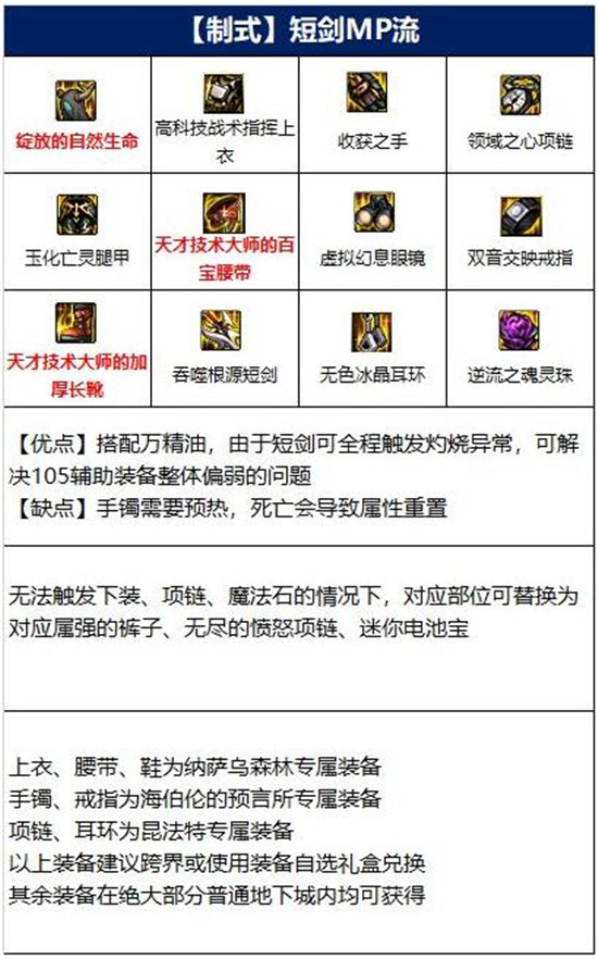 【优点】搭配万金油,由于短剑可全程触发灼烧异常,可解决105辅助装备偏弱的问题