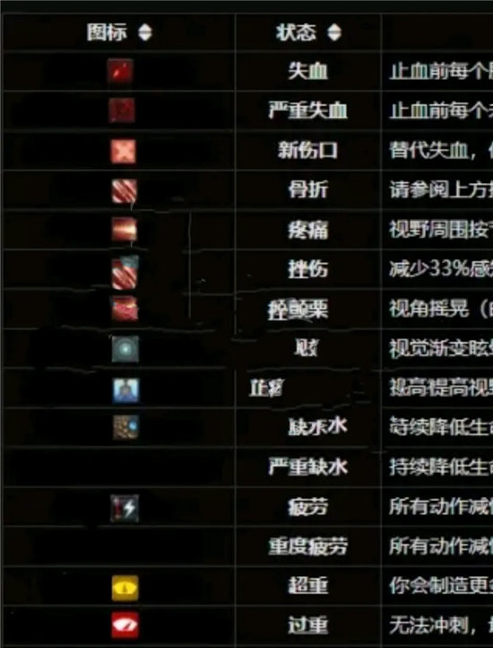 如果腿黑了的话,你就不能跑步了。如果你吃了止疼药,然后继续跑步或者跳跃的话,你的全身的血量都会掉,也就是我们所说的伤害扩散。如果你的胃黑了的话,你的角色会不停的咳嗽(声音非常的大),并且你的水分和能量会快速的流失。