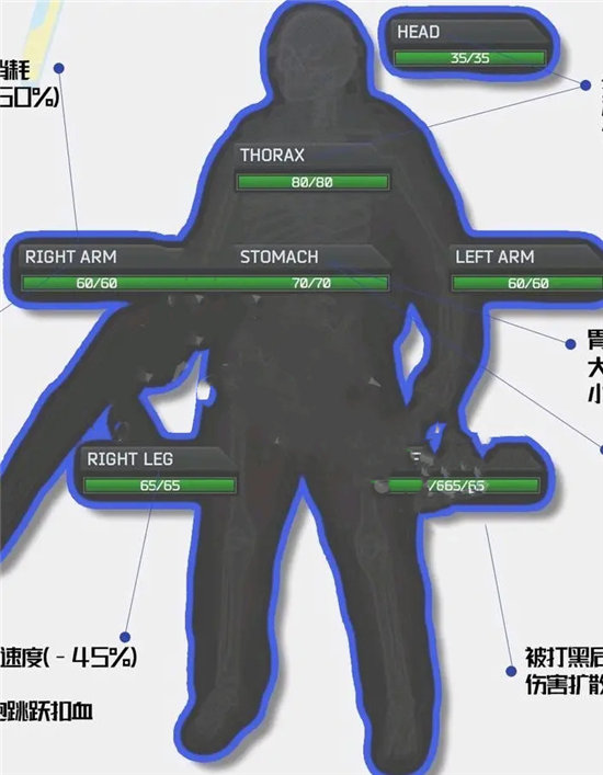 首先我们先讲一下塔科夫中人物的血量机制。这个血量极值和其他游戏是几乎完全不一样的: