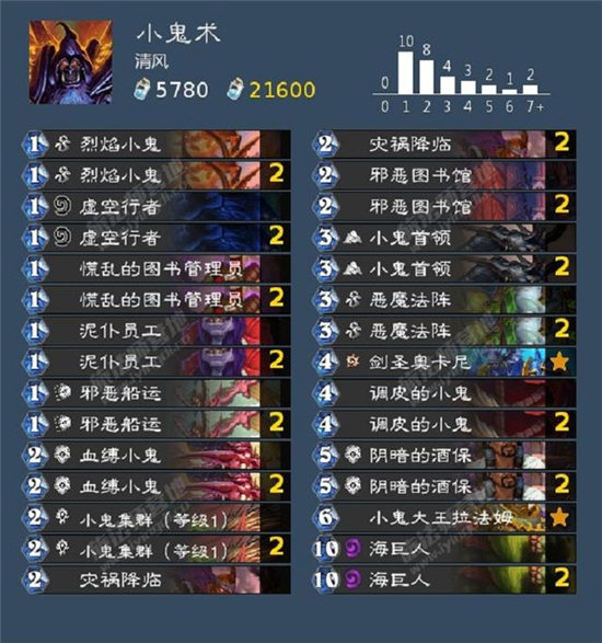 而能保证小鬼术一波接一波铺场质量的,就是调皮的小鬼了,小鬼术铺场能力非常强,因此注能也相当快,大多数情况下都可以赶在四费注完能,即使来得较晚注能的也比较快。至于小鬼大王拉法姆,之前大家在讨论能否优化掉拉法姆,但是清风打了一天后感觉拉法姆还真不太能去掉,尤其是很多起手没有地标的对局,拉法姆的铺场+Buff的作用非常关键,清风有很多把都是前期被解的七七八八,但最后靠拉法姆一波对面解不掉赢下的比赛。