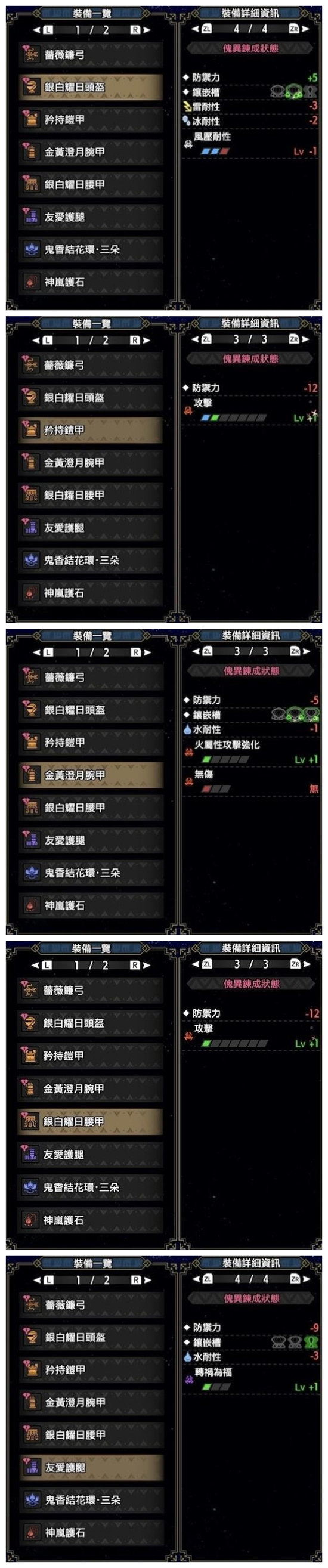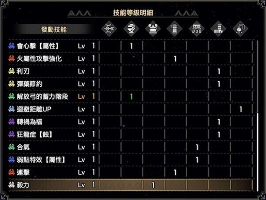 体术5、攻击4-7、超心3、弱特3、耐回3、箭种强化3、弹道2-3、早填2、属会心1、解放弓1、回距1-0、转祸1、狂龙1、合气1、属弱特1、连击1、毅力1。