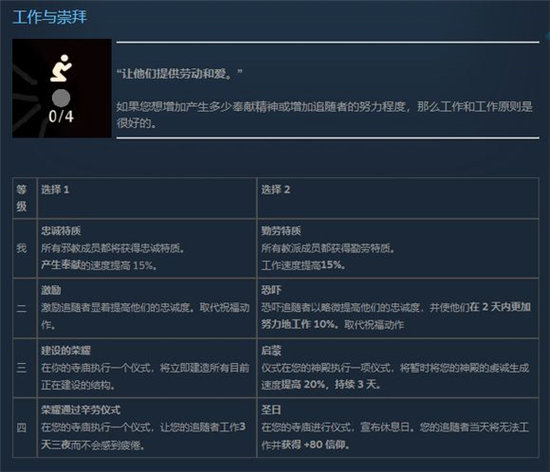 3.建设与启蒙:必选建设虔诚科技树点满就没用了,并且还是做个仪式后才给个BUFF,建筑瞬间完工就非常爽,在后期大建一造造一片时非常有用。(并且建筑完工能加一堆忠诚)。