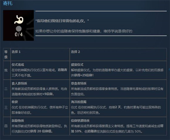 1.斋戒与盛宴:推荐斋戒,没有什么比不吃饭三天更好的了。两个都是消耗骨头,盛宴是直接回满,而斋戒是回满并且锁三天饱食度。忠诚的获取及其简单,所以也不需要担心掉忠诚的问题。