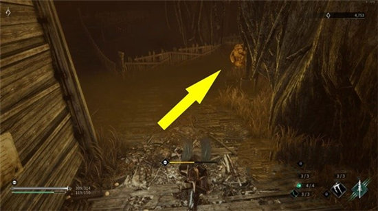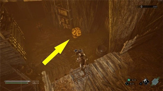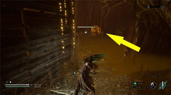 从小屋出来后,走右边的岔路,爬梯子下去,右拐往前走,走到头后向右看,右下方的地上有一个囊肿,等旁边的敌人背对你时,立刻下去摧毁囊肿。