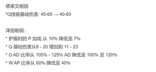 由于过去几个版本在路人局以及职业比赛中过于强势的表现,德莱文和泽丽这两个英雄也是引起了设计师的重视。尤其是泽丽近乎于在比赛中非Ban必选的地位,已经让下路的生态有些失衡。虽然在之前的几个版本泽丽已经连续被削弱,但依旧没有撼动她下路一姐的地位。