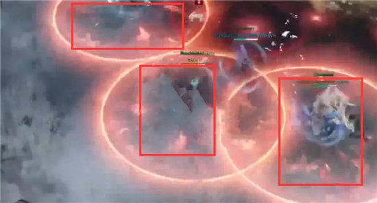 1、一号BOSS,玩家注意地面上显示的BOSS技能范围标识(红圈),注意躲避。当队伍中有角色头顶出现瞄准标识时,携带该标识的角色应离开团队聚集处,往地图边缘去躲避技能。